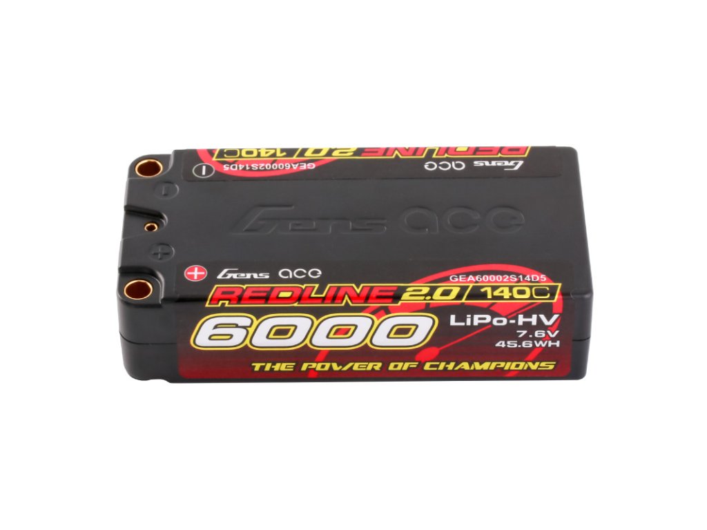 Gens Ace Redline 2.0 Series 2S 140C 6000mAh Hardcase LiPo Battery Pack, with a factory installed 5.0mm bullet. Consumers trust the Gens Ace name to deliver the dependability and high performance they expect. The Gens Ace 140C 2S 6000mAh 7.6V HV LiPo battery pack has a high-capacity, high-discharge rate that gives you the power and run-time you expect.